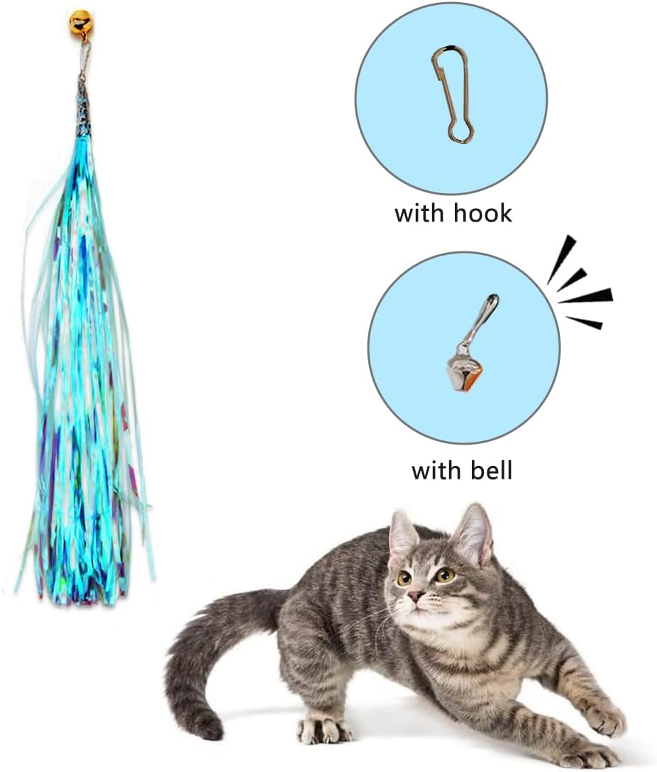 • [Cost-effective] Including 9 cat replacement feathers and 1 replacement rustling tassel paper, each cat wand attachments has an eye-hook connector, which can be connected to cat wand that can change cat feather toys , and the rustling tassel that makes a sound can attract the cat’s attention.