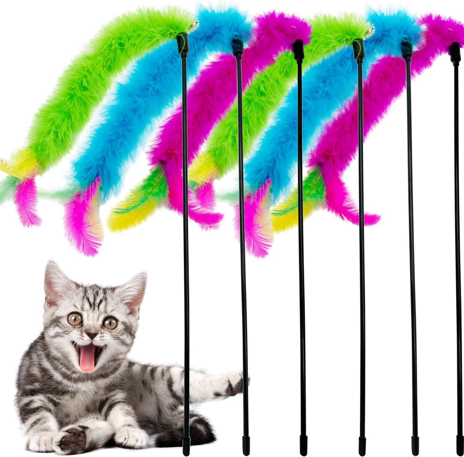 - 1.[Great Value Cat Wand Toys]: Include 6 PCS cat feather toy stick, the length of cat toys feather stick is about 15.7 inch, which is long enough for you to play with cats at a safe distance, so that you don’t need to worry about whether cats claws hurt you or not.
