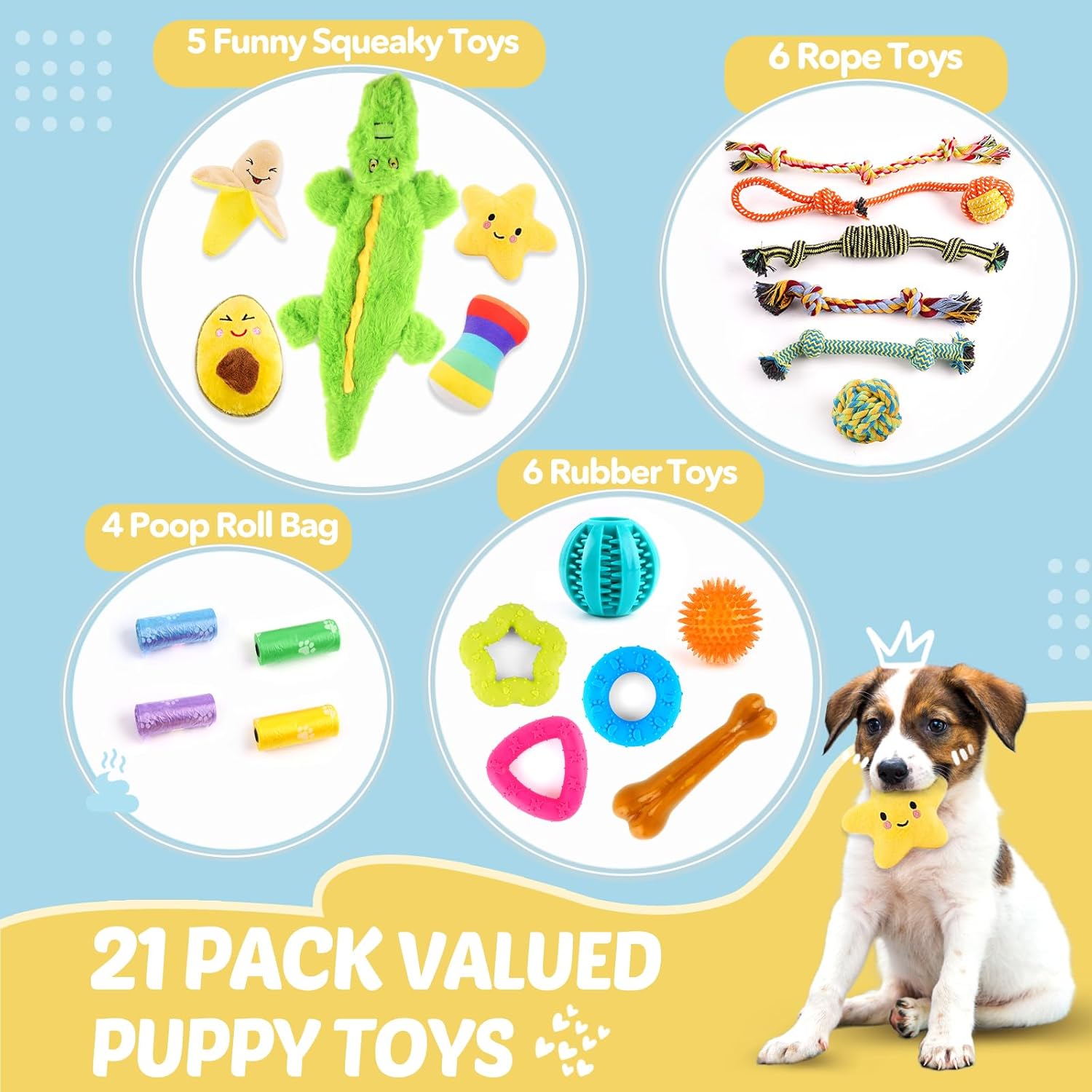 - 🐕【SUPER FUN LUXURY PUPPY TOY BUNDLE】 Pack of 21 adorable puppy toys, including 5 squeaky fun toys, 6 new rubber toys, 6 sturdy rope toys, and two bonus poops brings a roll as a gift so you get a great value small dog toys set. More kinds of dog toys can meet the needs of dogs for teething, self-play, training and interactive toys games. Make getting along with your dog more enjoyable.
