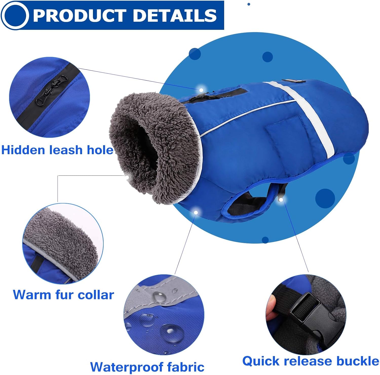 - UNIQUE & CREATIVE DESIGN: Reflective strips on the warm dog coat provide high visibility in the dark, which keeps your puppy safe. The dog fleece jacket is also designed with hidden leash hole for controling your dog. And the furry collar can be stand-up and put down when necessary